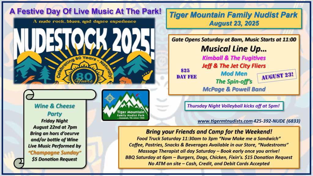 - To help speed up entry to the park, for this Nudestock event only, you can pre-register and pay your non-refundable day-membership fee(s) online at Tiger Mountain Family Nudist Park » Day Use Pass – Non Members (tigermtnudists.com).